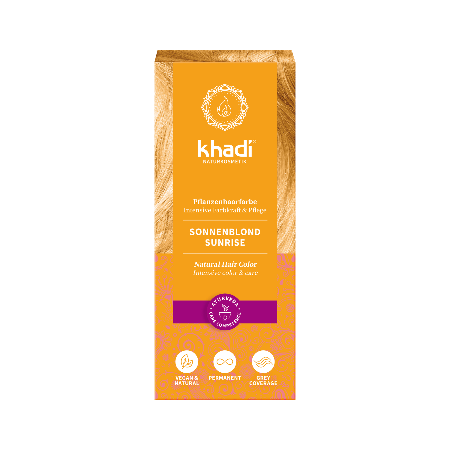 Khadi Sluneční blond pokryje i šedé vlasy - v zářivém odstínu sluneční blond. Nemá však zesvětlující účinky, protože je čistě rostlinná, bez peroxidu a syntetických látek. Cenné, čistě rostlinné ingredience dávají vlasům intenzivní obarvení, zářivý lesk a bohatou péči. Dodají barvu, objem a lesk v jednom kroku!