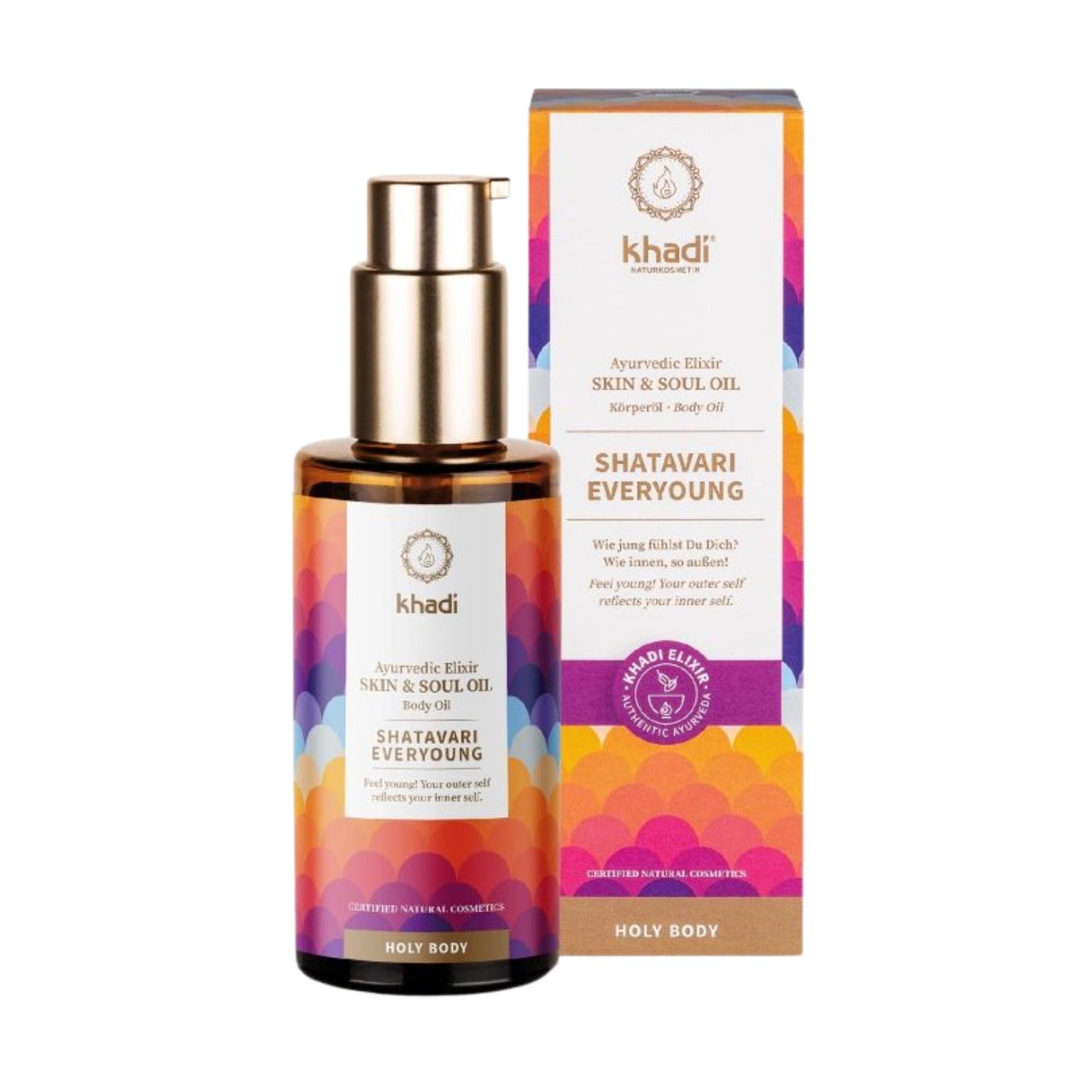 Khadi elixír olej Shatavari Everyoung je součástí série "Holy Body", kterou tvoří spolu s Khadi elixír oleji Růžový lotos Krása a Růže Láska. Ta je synonymem pro holistickou, celistvou péči, zahrnující tělo i duši. Integrální součástí ajurvédy byla vždy i aromaterapie. Khadi péče o krásu v sobě nese pravý ajurvédský komplexní přístup. Khadi elixír oleje pro pokožku a duši působí na pleť jako hudba na duši.