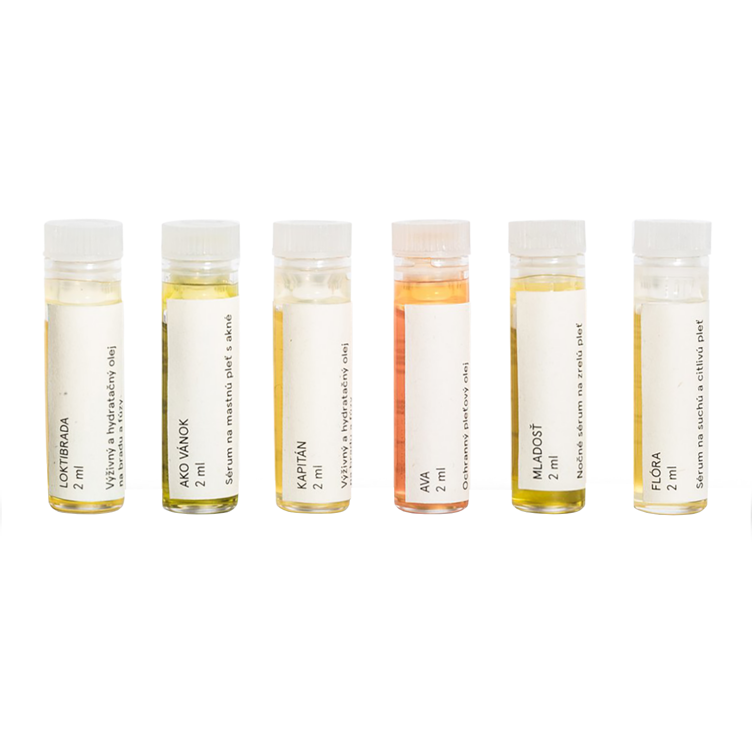 Mandlový olej, Arganový olej, Avokádový olej, Jojobový olej, Ricinový olej, přírodní Vitamín E, senciální olej z Limetky, Pačuli, Levandule