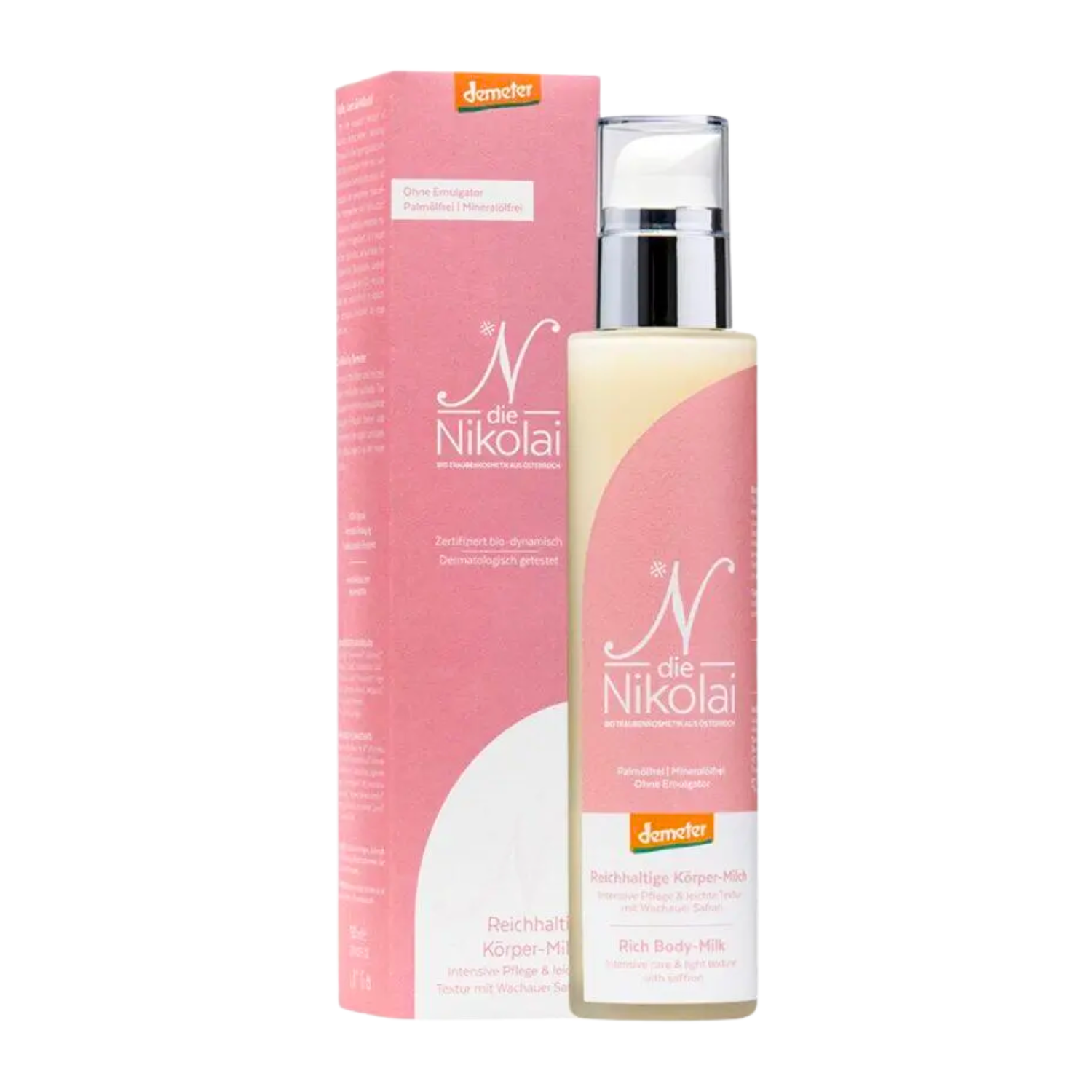 Regenerační tělové mléko dieNikolai je ryze veganský produkt určený pro suchou pokožku a pro pokožku, která potřebuje během dne doplnit přísun živin. Základem tělového mléka jsou regionální suroviny v bio a biodynamické kvalitě, které intenzivně, a přitom velmi jemně působí na pleť. Obsažený olej a výluh z hroznových jader vyživuje pokožku a dodává jí potřebné antioxidanty. Šafrán zklidňuje podrážděnou pokožku. Slunečnicový olej dostatečně promastí a vyživí Vaši pokožku, sirup z bezových jader zklidňuje pokožku a působí protizánětlivě a olivový olej zvláčňuje pokožku a činí ji sametově jemnou.