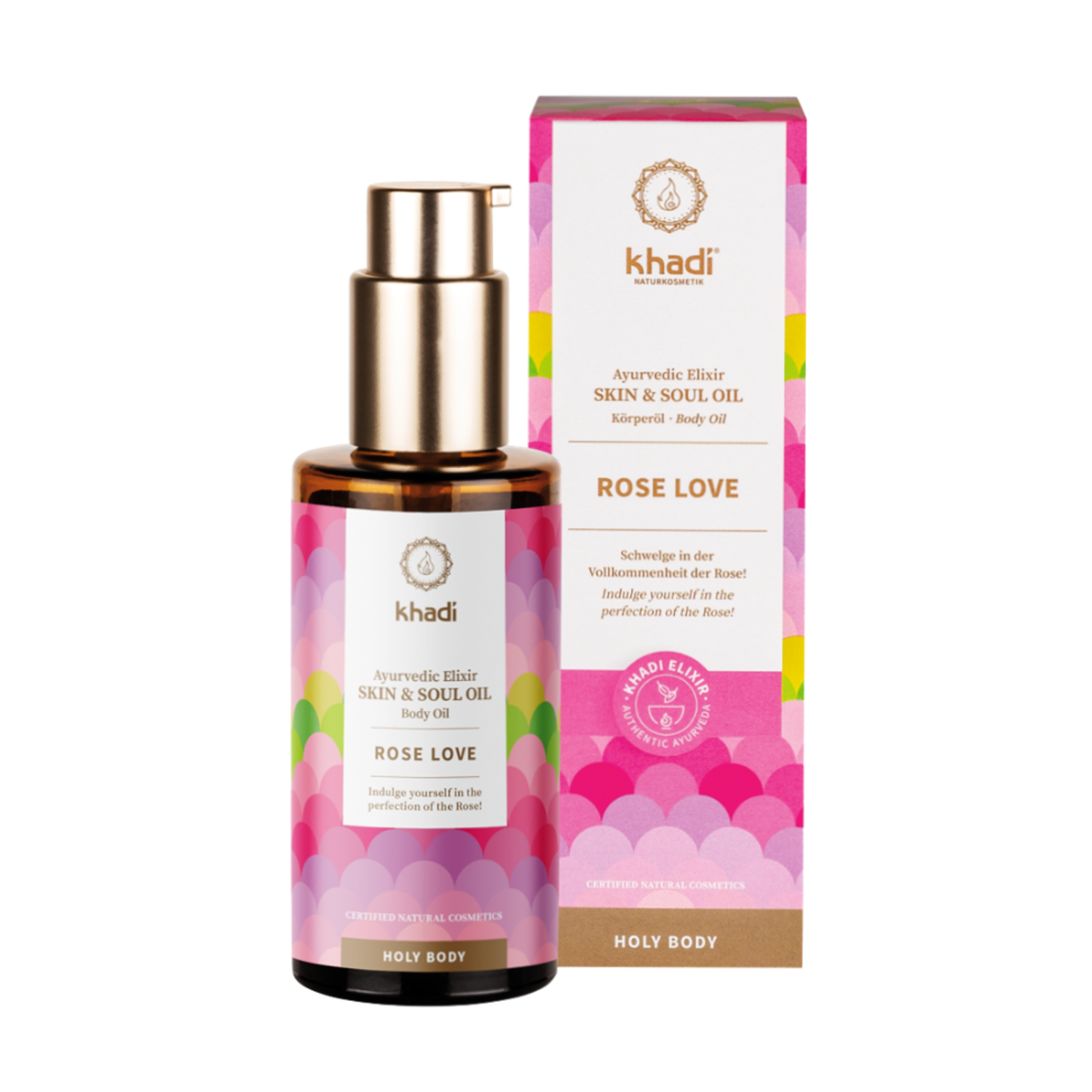Khadi elixír olej Růže Láska je součástí série "Holy Body", kterou tvoří spolu s Khadi elixír oleji Shatavari Everyoung a Růžový lotos Krása. Ta je synonymem pro holistickou, celistvou péči, zahrnující tělo i duši. Integrální součástí ajurvédy byla vždy i aromaterapie. Khadi péče o krásu v sobě nese pravý ajurvédský komplexní přístup. Khadi elixír oleje pro pokožku a duši působí na pleť jako hudba na duši.