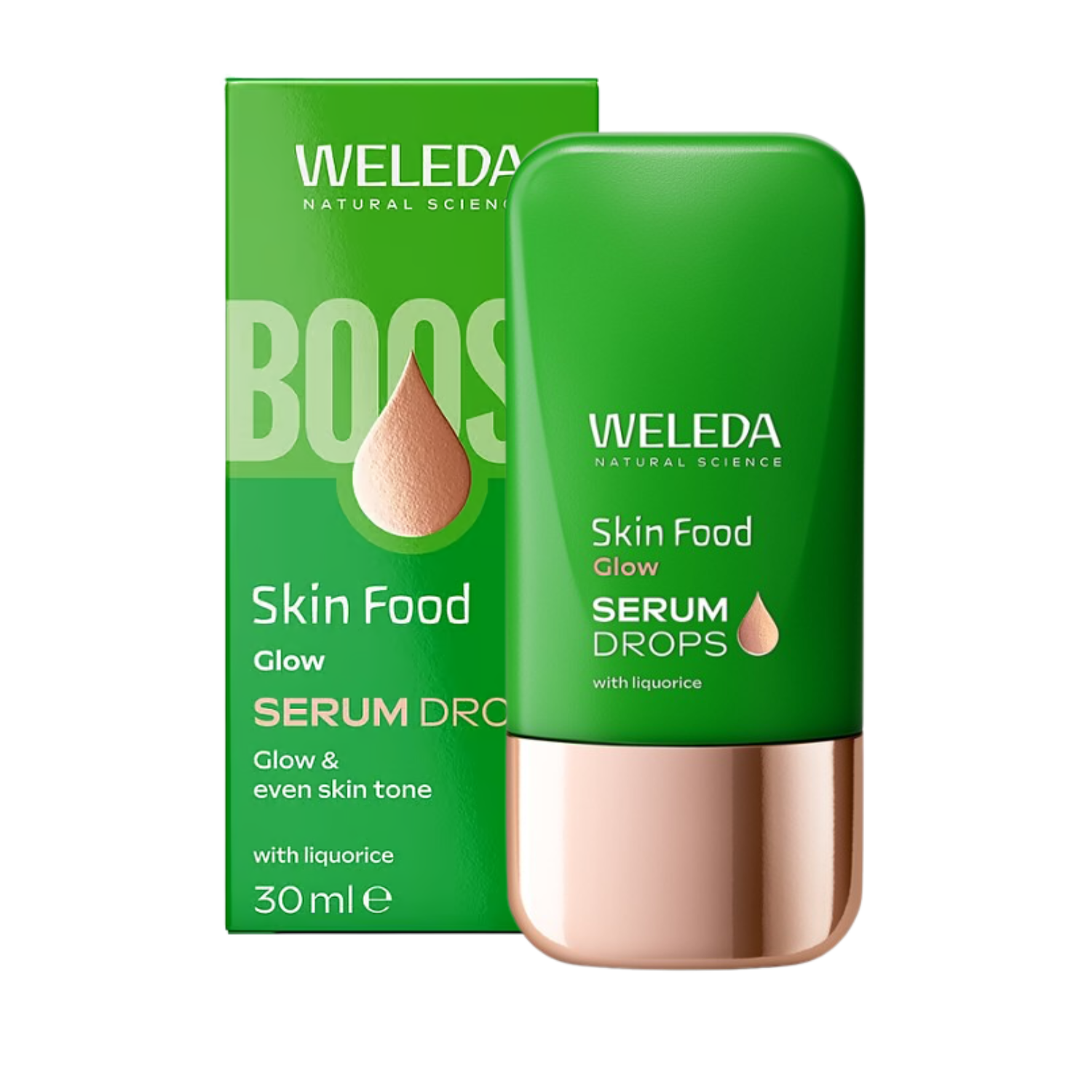 Skin Food Glow Serum Drops dodává pleti okamžitý jas, zdravý vzhled a sjednocený tón. Spojuje rozjasňující pigmenty s aktivními rostlinnými složkami pro svěží, přirozeně zářivý efekt během několika vteřin. Extrakt z lékořice a listů ječmene působí antioxidačně, zklidňuje a pomáhá redukovat pigmentaci. Minerální pigmenty pleť opticky projasňují. Sérum hydratuje a chrání před oxidačním stresem. Lehká textura se rychle vstřebává a umožňuje multifunkční použití – samostatně, s krémem nebo jako rozjasňující booster do make-upu.