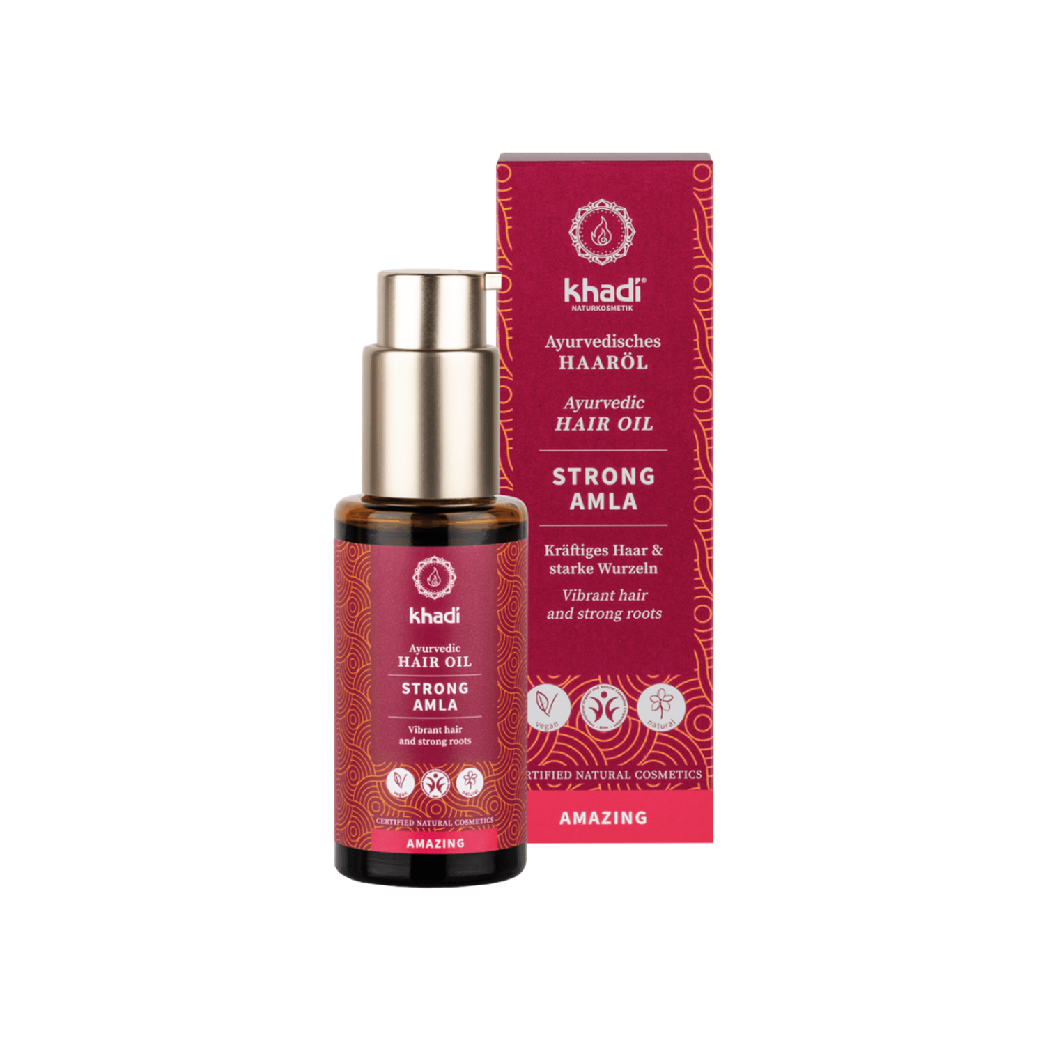 Tajemstvím Khadi oleje MOCNÁ AMLA pro vlasy a vlasovou pokožku je tajuplný mocný účinek Khadi elixíru: pomocí tisíce let starých tradičních ajurvédských procesů jsou vybrané indické léčivé byliny a plody ohřívány nad otevřeným ohněm, citlivě a za podmínek v závislosti na ingredienci, v řádech hodin či dokonce dní.