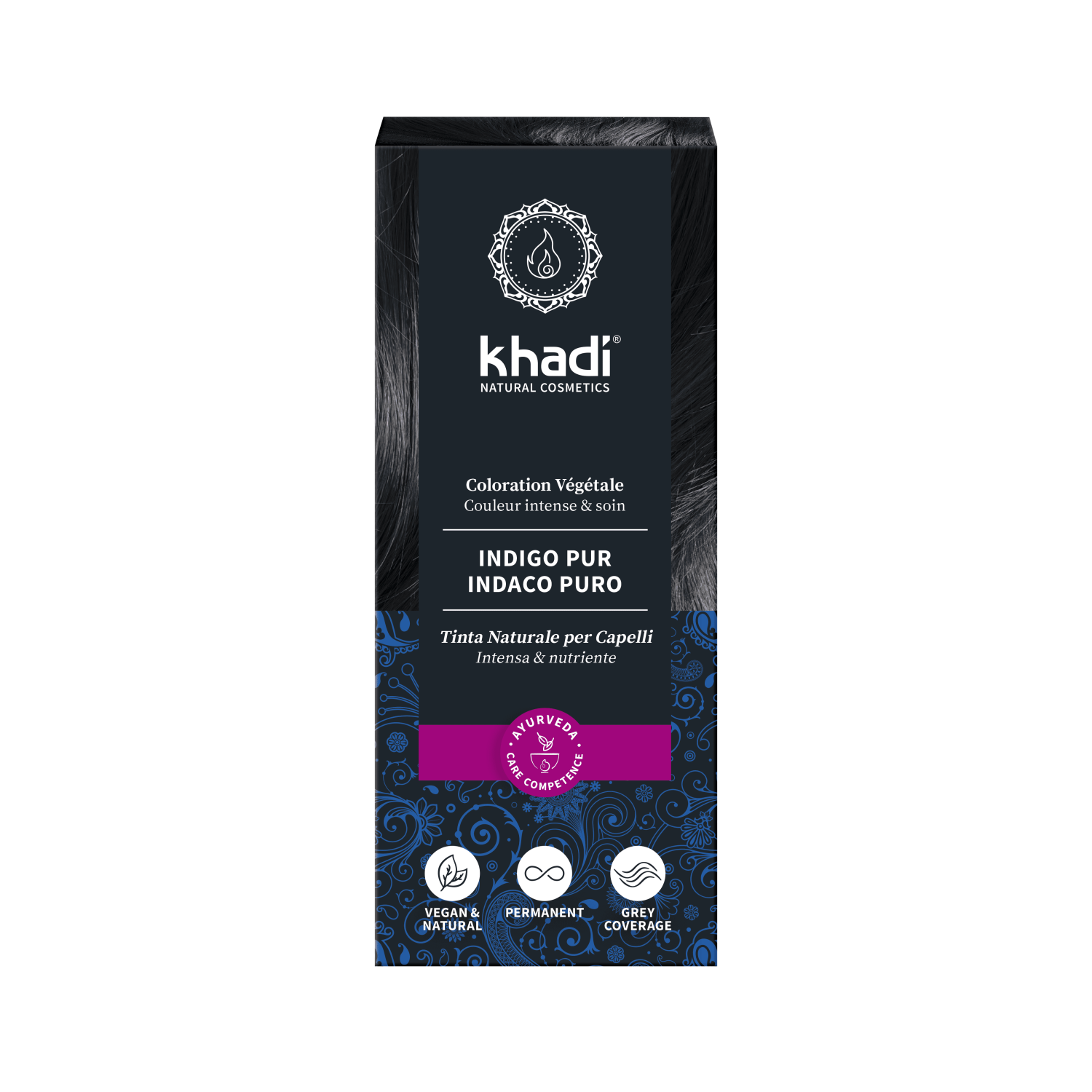 Rostlinná barva na vlasy Khadi Čisté indigo barví vlasy černým odstínem, s chladným modrým odleskem.