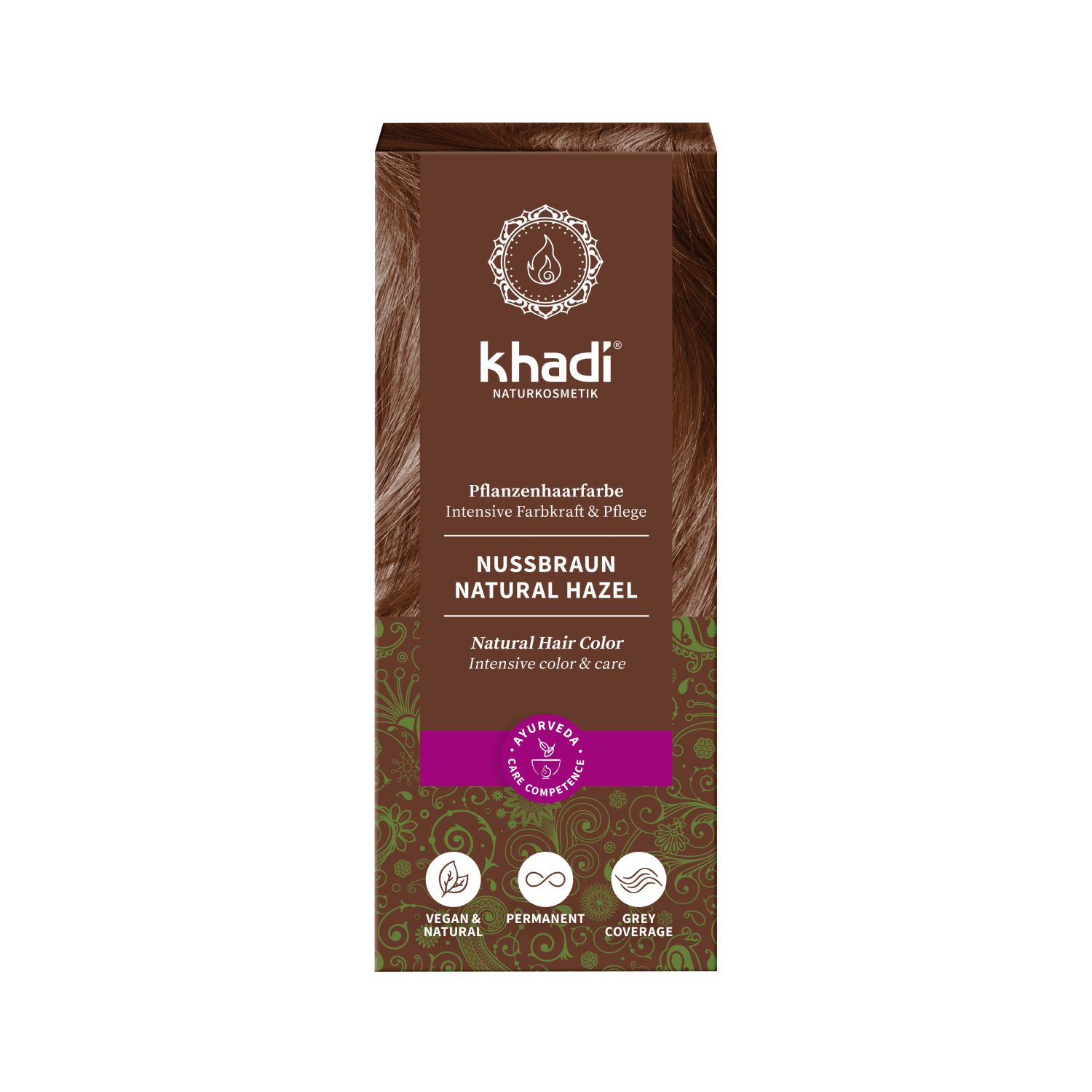 Khadi Oříškově hnědá je čistě přírodní barva na vlasy bez syntetických barvicích složek, zvýrazňovačů barev, kovových solí či konzervantů.